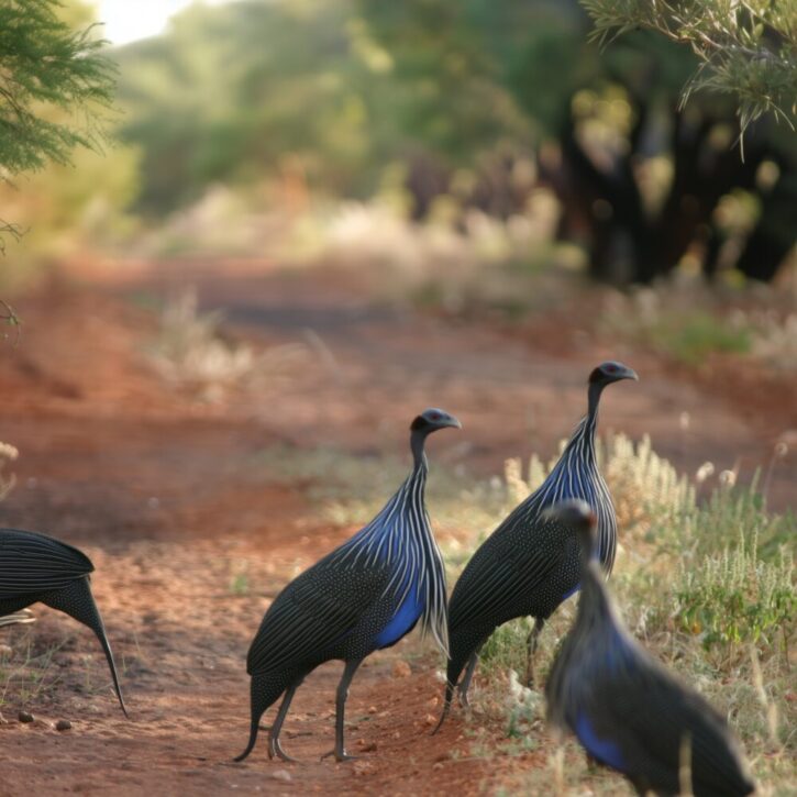 The Vulturine guinea fowl is strikingly colorful, with plumage that both stands out and, surprisingly, blends into the thick bush where it usually trots about, foraging for insects, seeds, and other edible stuff on the ground.